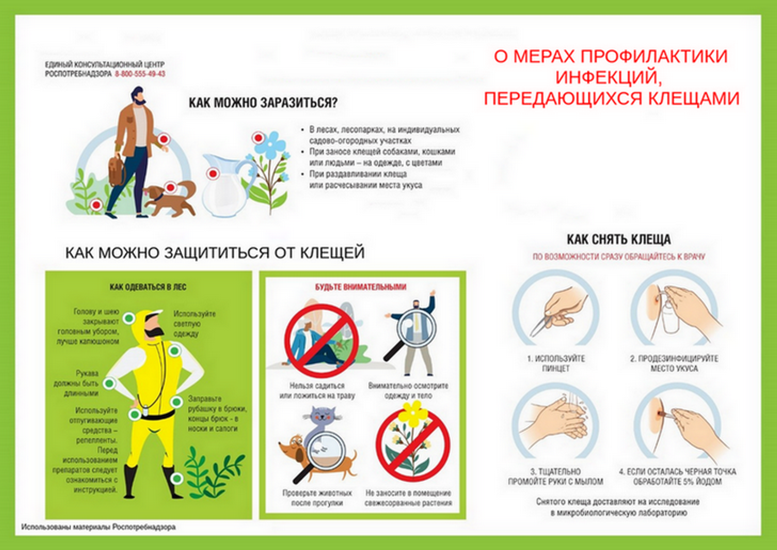 Если клещ всё же укусил — необходимо удалить его, обработать место укуса, сдать на анализ. Список лабораторий по республике, в которые можно сдать на анализ клеща, представлен по ссылке.